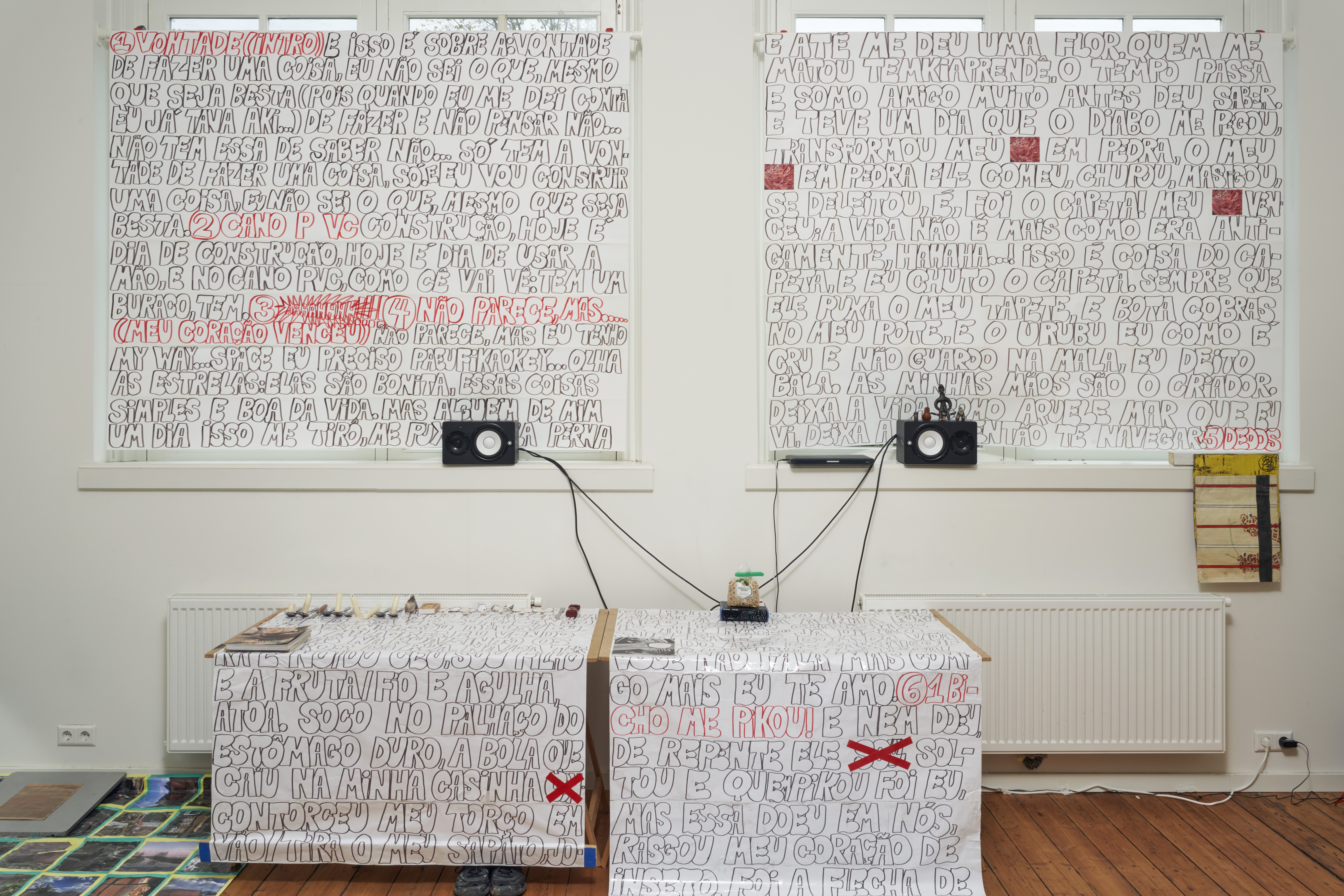 Installation; graphite, marker, ecoline, gouache, ink, inkjet print and tape on paper; found wood, objects and musical instruments